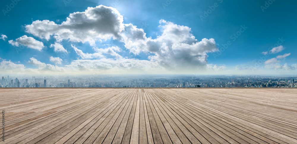 Fototapeta Wooden square and city skyline with buildings in Shanghai,China.