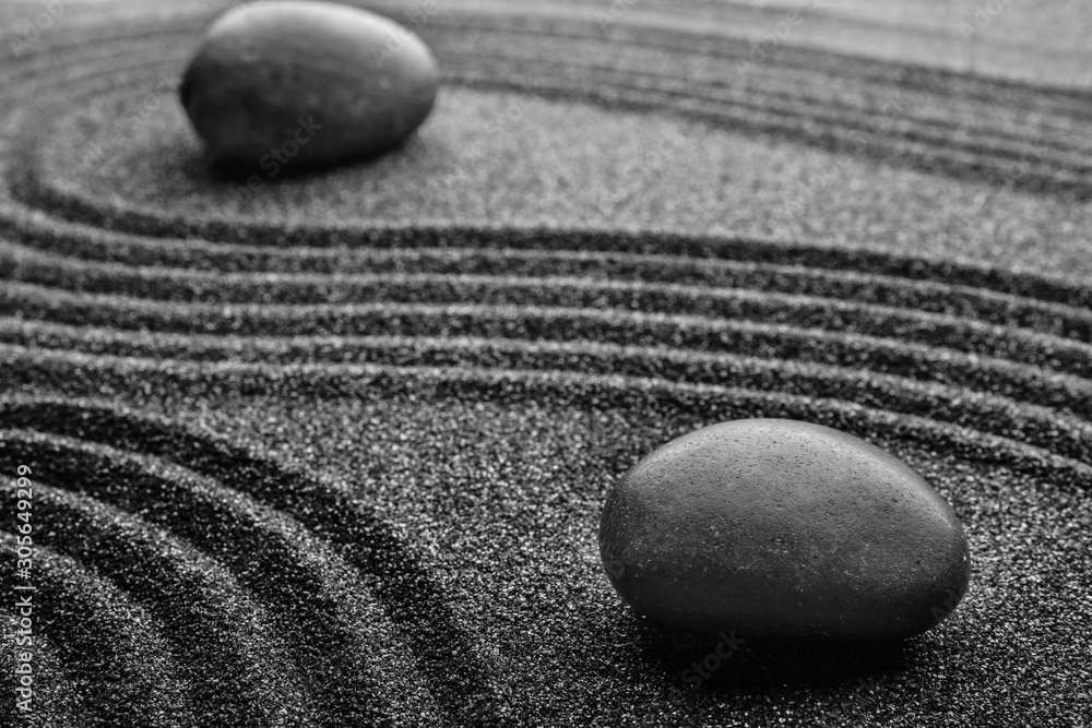 Fototapeta Black sand with stones and beautiful pattern. Zen concept