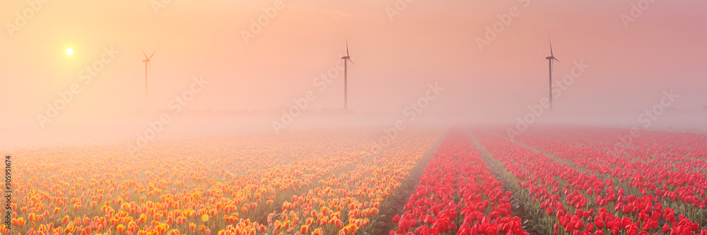 Fototapeta Sunrise and fog over rows of blooming tulips, The Netherlands