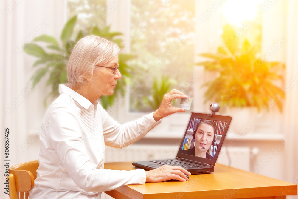 Fototapeta e-id concept: senior woman using a video identification service to open a new ba
