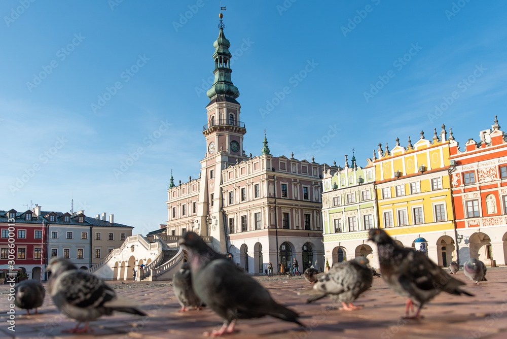 Fototapeta View of Great Market Square in Zamosc Poland with city pigeons, renaissance and