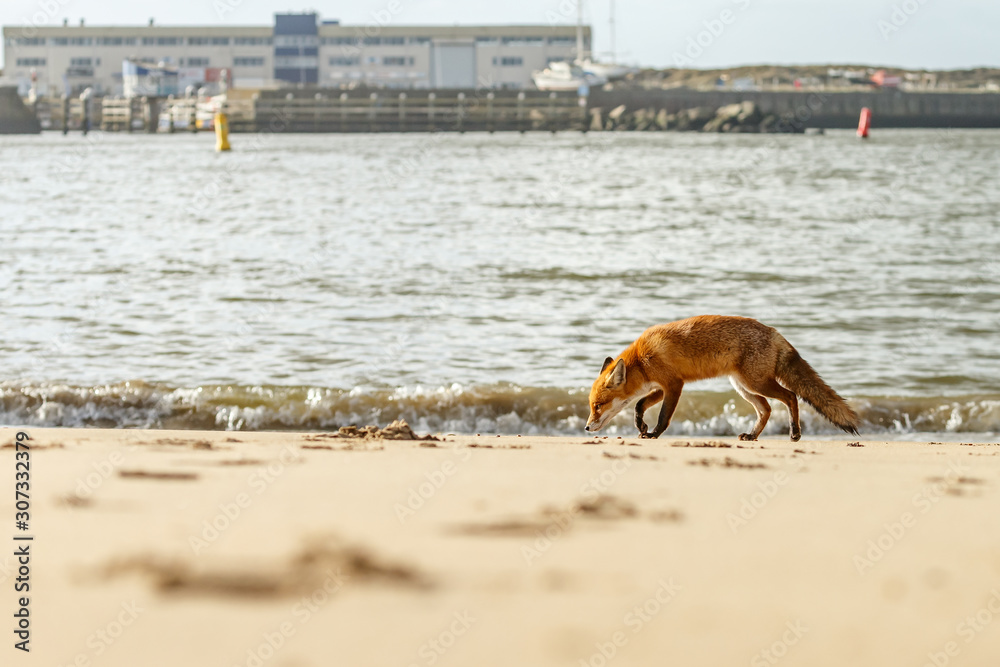 Fototapeta Red fox standing on the beach at the North Sea