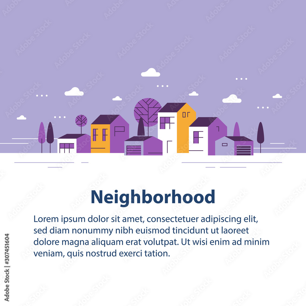 Fototapeta Small town, tiny village view, row of residential houses, beautiful neighborhood
