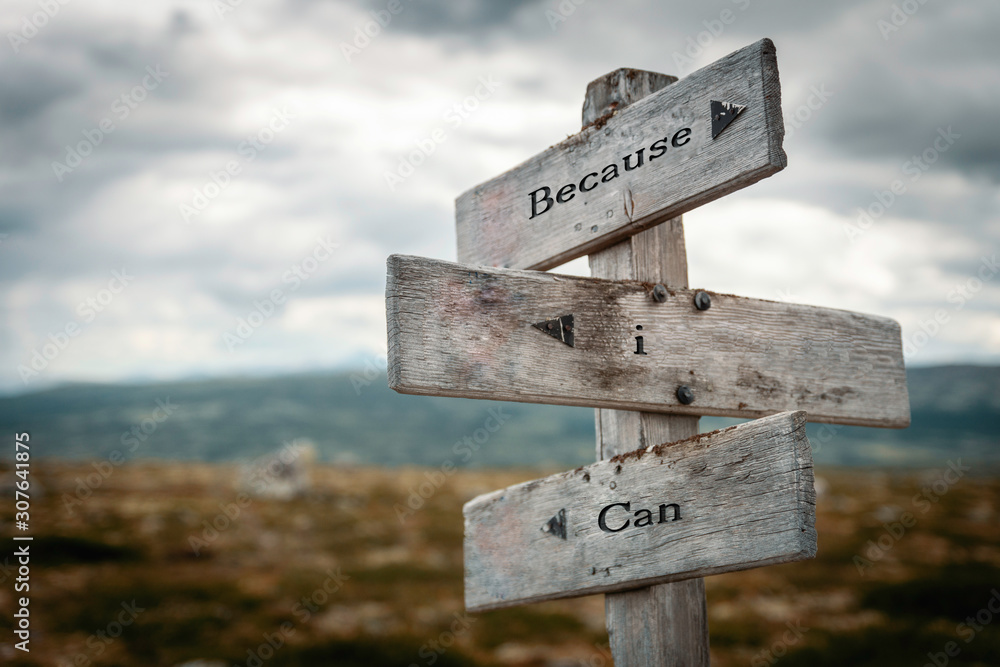 Fototapeta Because i can text on wooden rustic signpost outdoors in nature/mountain scenery