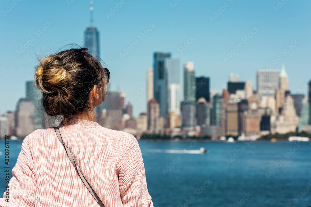 Fototapeta Woman in pink sweater posing on the background of New York city