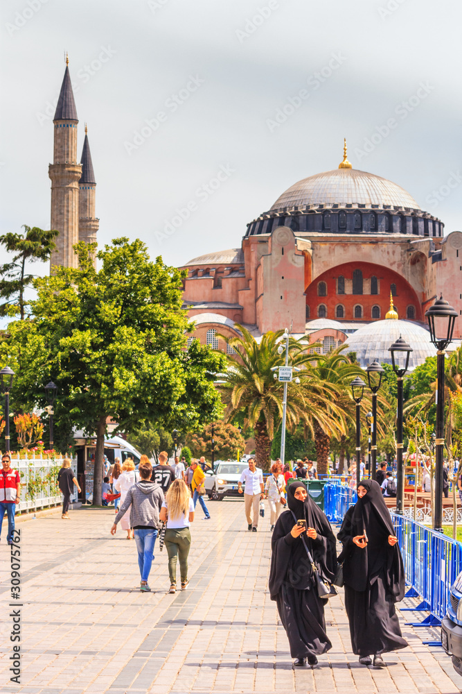 Fototapeta Summer cityscape - view of people walking on the background of Hagia Sophia, Ist