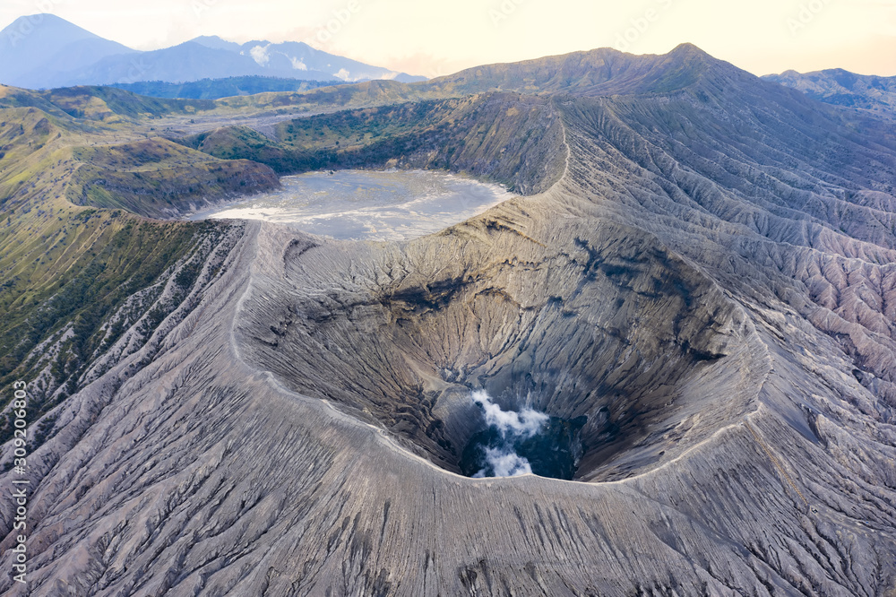 Fototapeta View from above, stunning aerial view of the Mount Bromo with clouds of gases raising from the crater