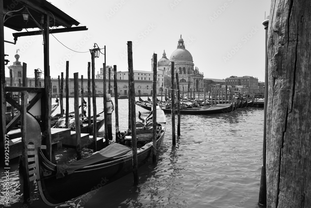 Fototapeta black and white of gondolas on grand canal in venice