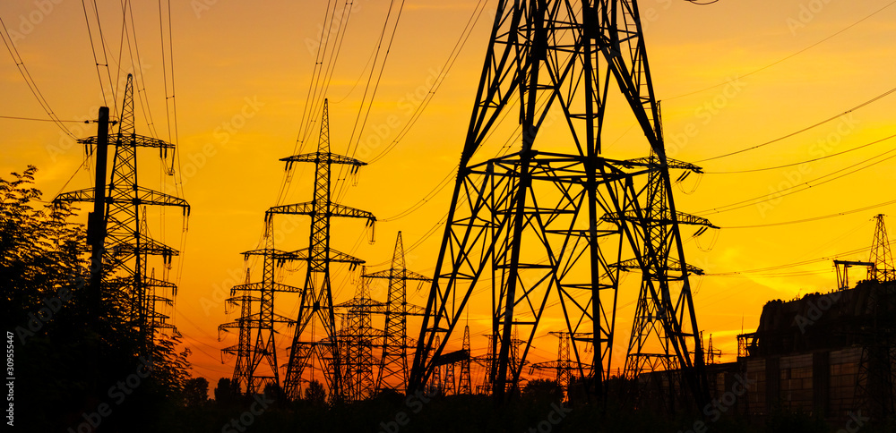 Fototapeta Electricity pylons bearing the power supply across a rural landscape during sunset