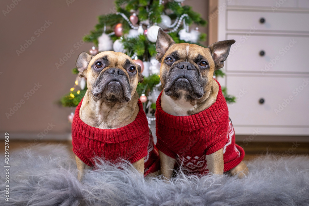 Fototapeta Pair of French Bulldog dogs wearing matching red knitted Christmas sweater sitti