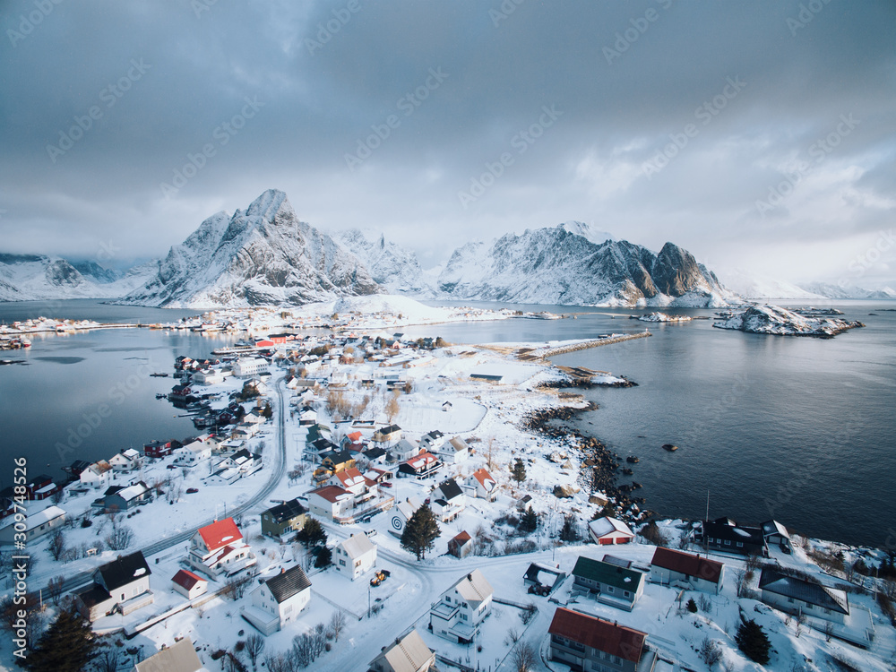 Fototapeta Reine, aerial view with snow. Lofoten Islands, Norway