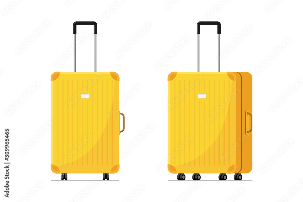 Fototapeta Yellow plastic suitcase for travel with wheels and retractable handle front and side view