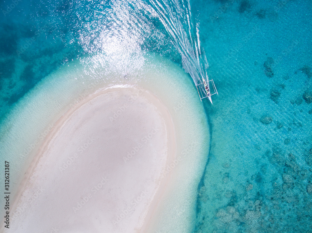 Fototapeta A small native bamboo and diesel boat outboard motors past a white sandbar beach