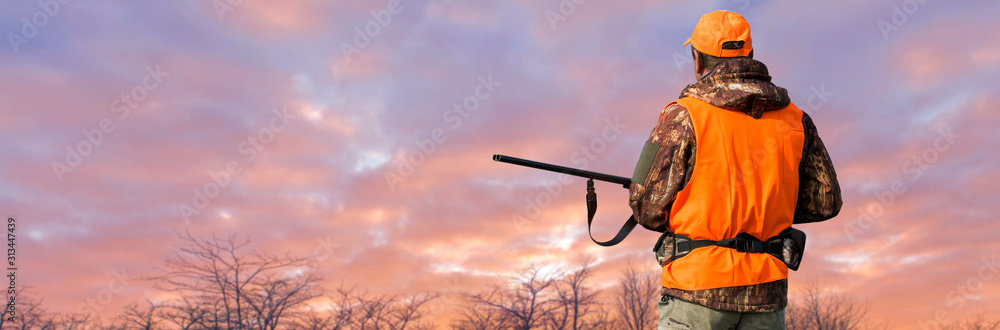 Fototapeta Silhouette of a hunter on the background of the morning red dawn