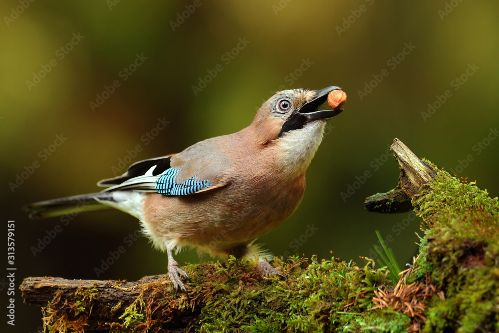 Fototapeta Eurasian Jay bird on old stump. (Garrulus glandarius)