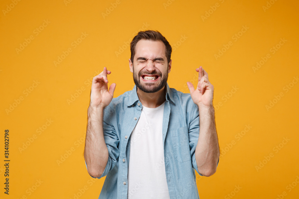 Fototapeta Young bearded man in blue shirt posing isolated on yellow orange background