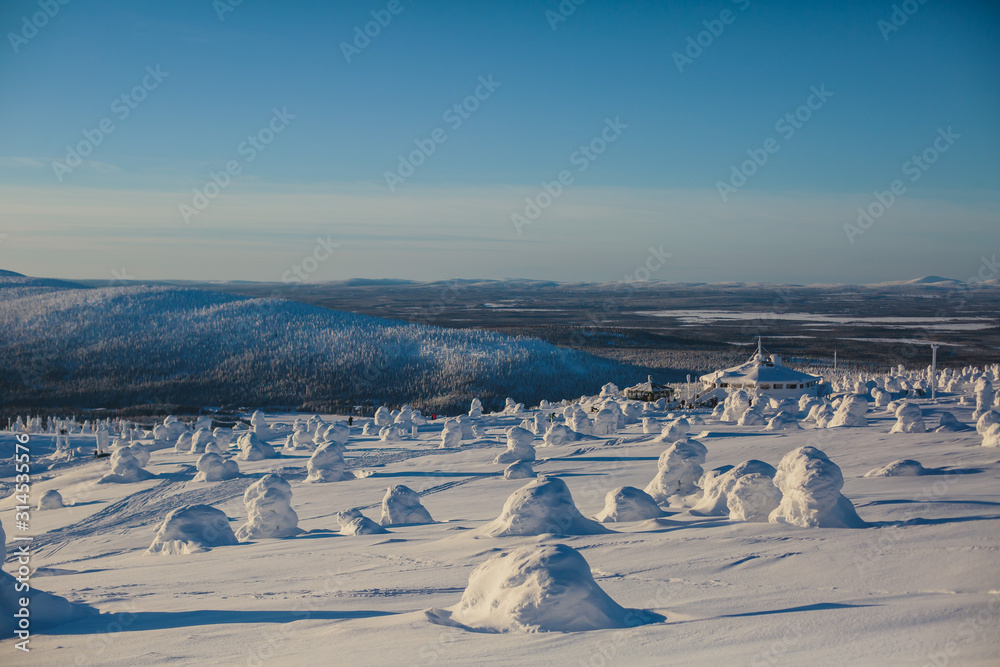 Fototapeta Beautiful vibrant aerial winter mountain view of ski resort, sunny winter day wi