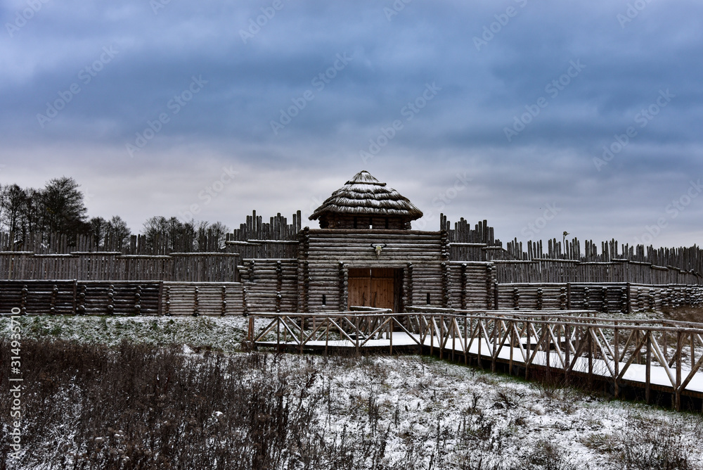 Fototapeta Old medieval wooden fortress in winter