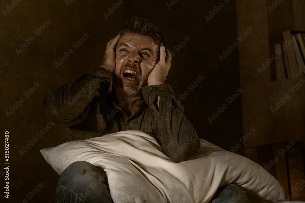 Fototapeta dramatic portrait of depressed and sick man suffering from psychosis illness or