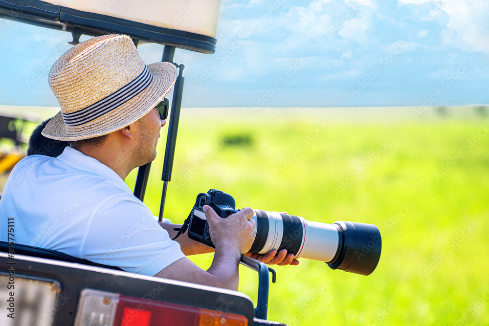 Fototapeta The man photographer takes a picture from touristic vehicle on tropical safari