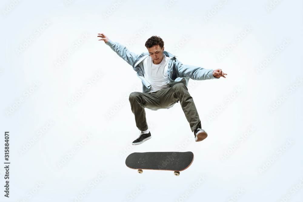 Fototapeta Caucasian young skateboarder riding isolated on a white studio background
