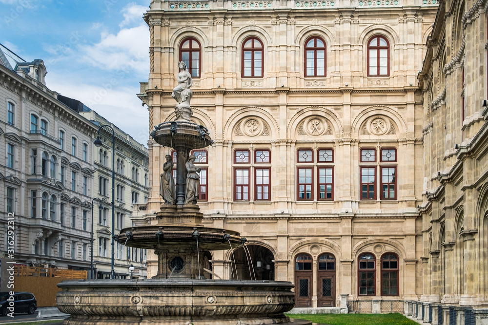 Fototapeta A fountain with Statues in front of the Opera in Vienna, Austria.