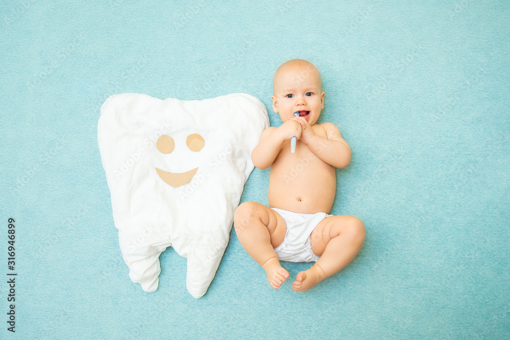 Fototapeta Cute baby lies with a toothbrush on a blue background