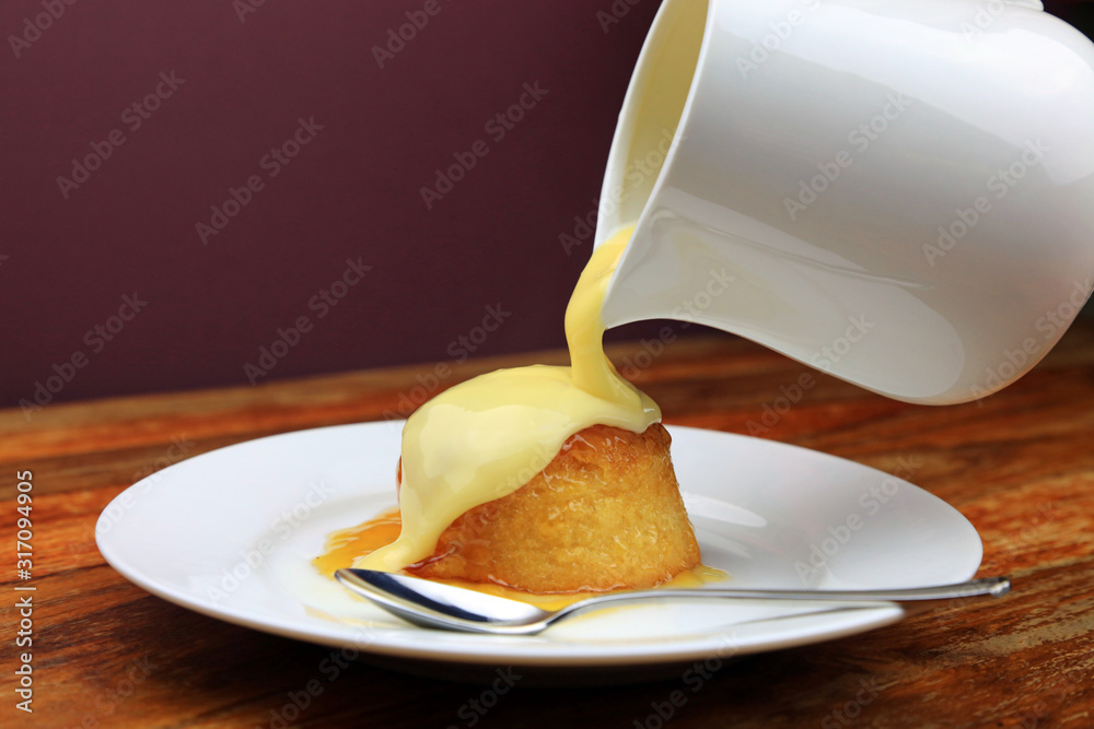 Fototapeta Hot custard being poured from a jug over a treacle sponge pudding