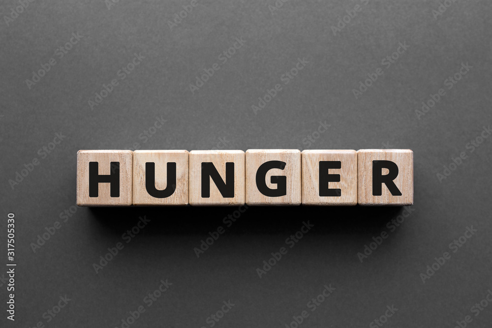 Fototapeta Hunger - words from wooden blocks with letters, need to eat hunger concept, top