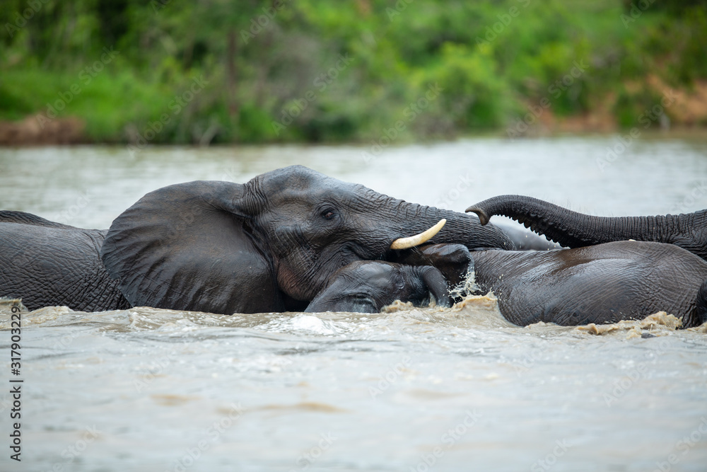 Fototapeta A herd of elephants having a swim early on an overcast afternoon.
