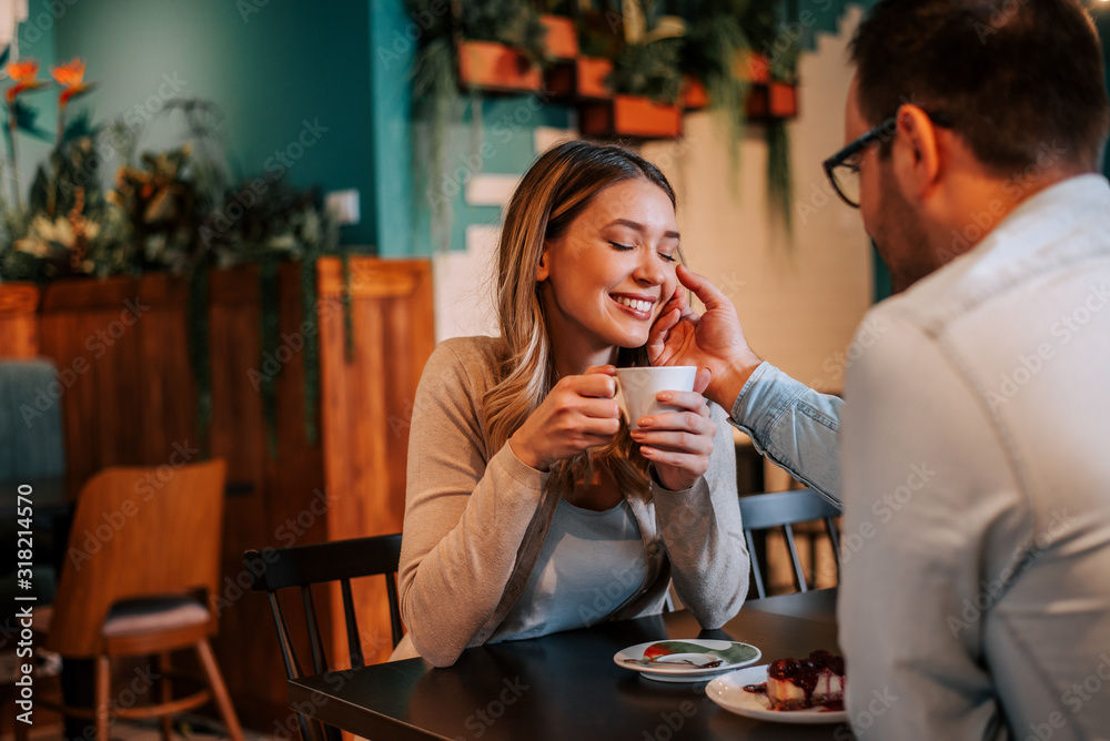 Fototapeta Tender man caress his girlfriend, touching her face with hand, at the cafe