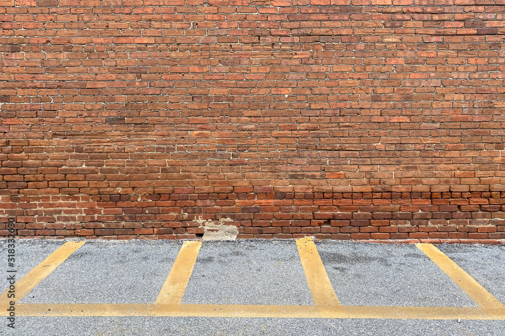 Fototapeta red brick building wall alley yellow loading zone parking space asphalt driveway