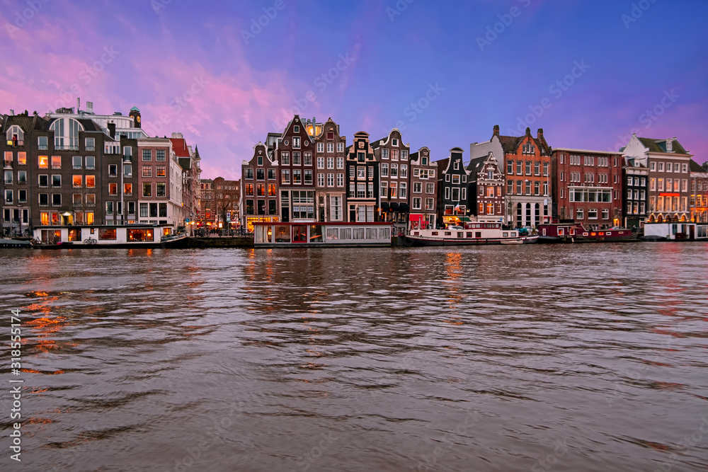 Fototapeta Traditional houses along the river Amstel in Amsterdam the Netherlands at sunset