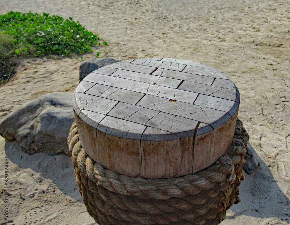 Fototapeta Round wooden capstan on a beach in Dubai, also acting as a coffee table