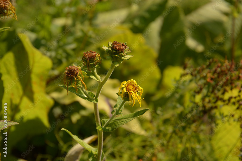 Fototapeta ashy sunflowers in late summer with brown dried petals, helianthus mollis autumn