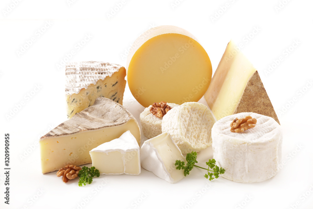 Fototapeta various french cheese portion isolated on white background