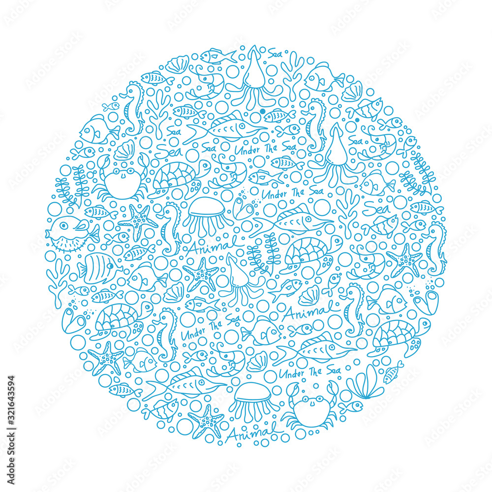 Fototapeta Sea animals icon set in round shape, line, sketch, doodle style