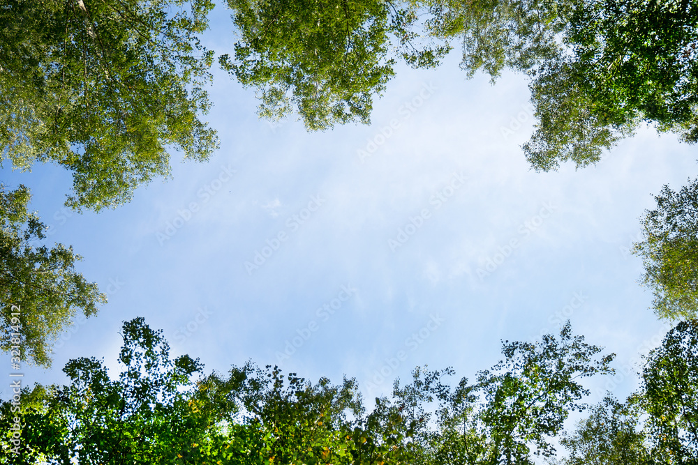 Fototapeta Blue sky framed by green foliage. Frame with copy space.