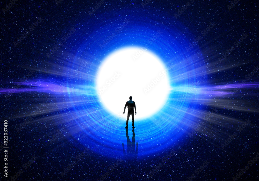 Fototapeta Man silhouette at the end of the tunnel with the universe and blinding light in
