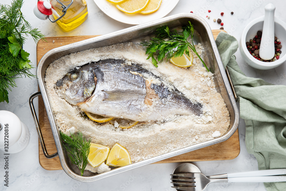 Fototapeta delicious salt-baked dorada fish with lemon and herbs