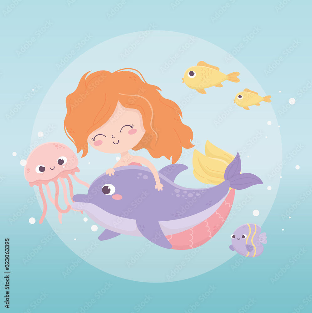 Fototapeta mermaid jelyfish fishes bubbles cartoon under the sea