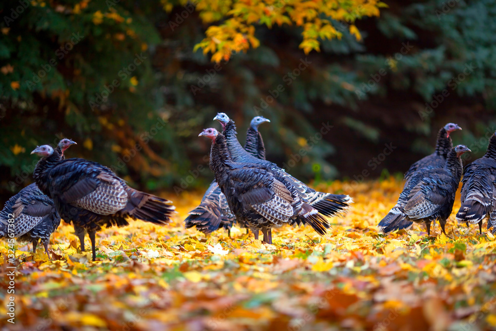 Fototapeta Turkeys in the Fall Autumn Leaves