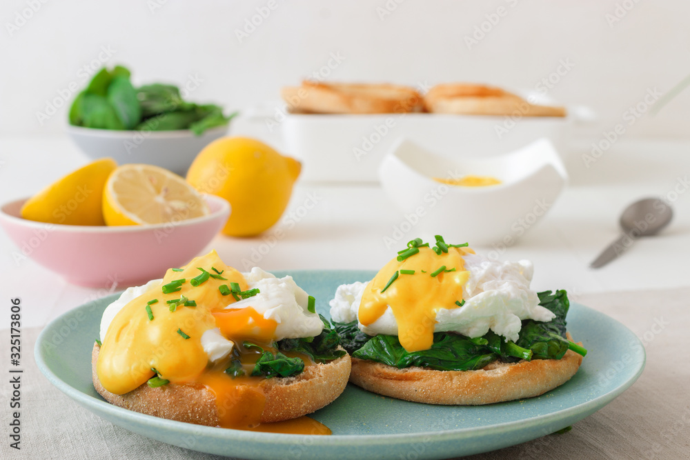 Fototapeta Eggs Florentine, English muffins, grilled ham, poached eggs, Hollandaise sauce, chive herbs, lemon, cup of coffee