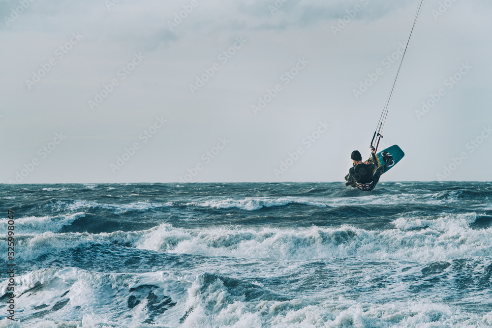 Fototapeta Kite surfing in storm in winter with extreme high jumps.