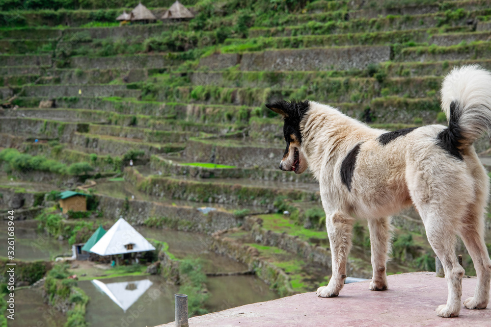 Fototapeta Dog enjoying the view of the rice terraces in which the rice have been harvested