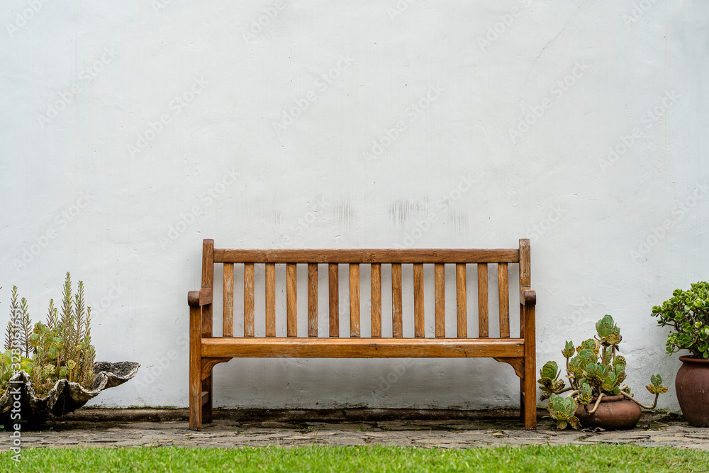 Fototapeta Wooden bench front of a white wall