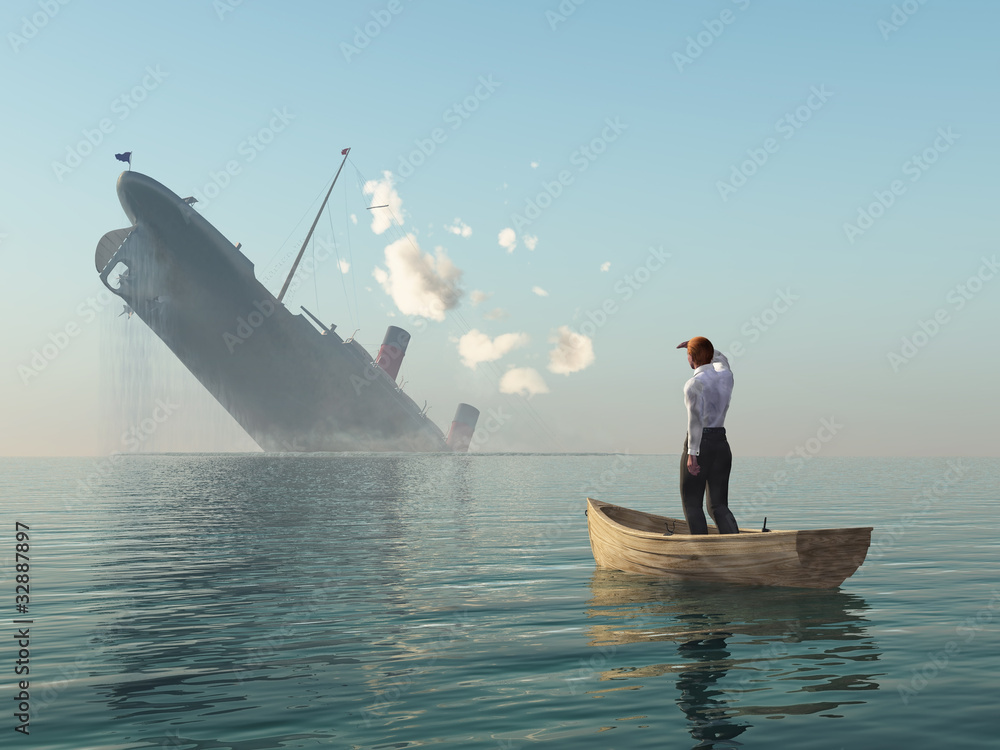 Fototapeta rescued man in boat looking on shipwreck