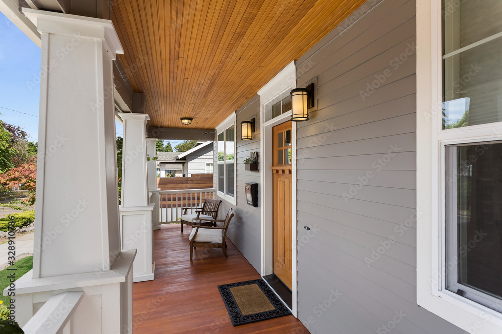 Fototapeta Covered porch and front door of beautiful new home
