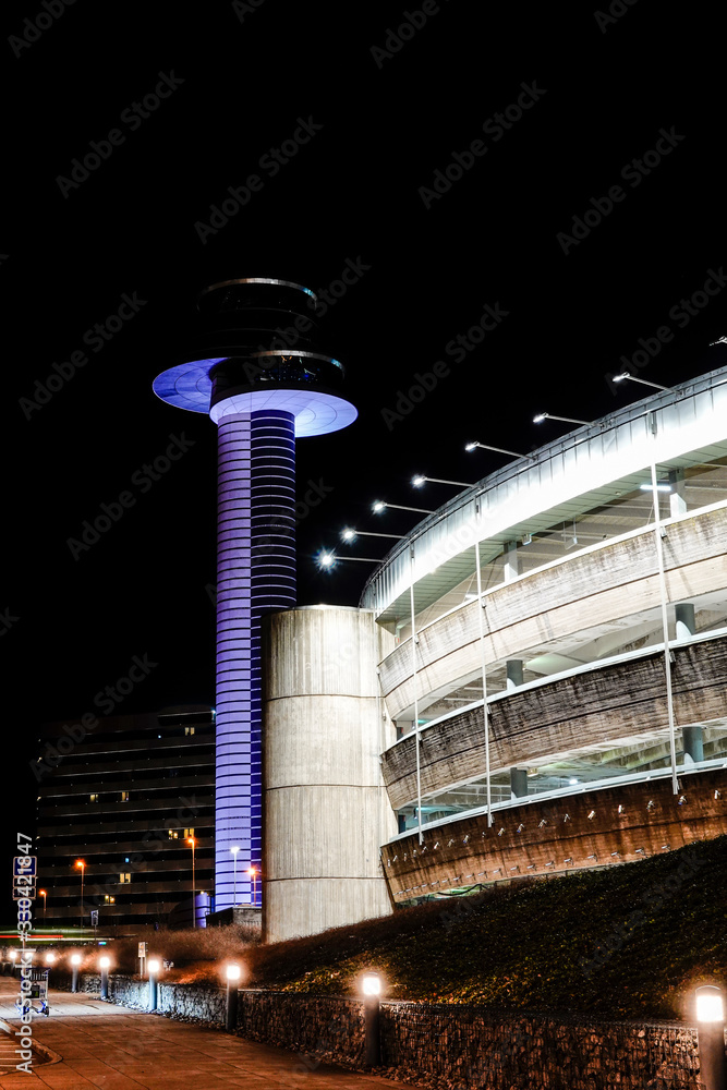 Fototapeta Stockholm, Sweden The control tower and a parking garage at night