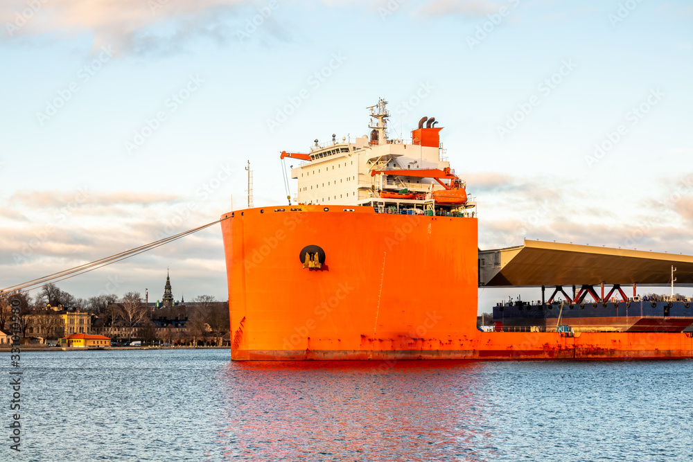Fototapeta Seascape closeup side view of a large orange semi-submersible heavy-lift ship with large load entering harbor in Stockholm Sweden